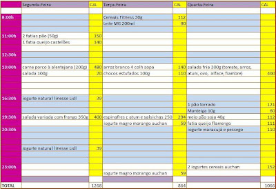 Como vão as coisas?!? Espero que bem! Trago-vos hoje os menus de segunda, terça e quarta feira, para verem como me tenho saído. Devo dizer que segunda tentei ingerir poucas calorias, já que no domingo à noite foi dia de asneira (Pizza Hut!!! Nham nham :) )